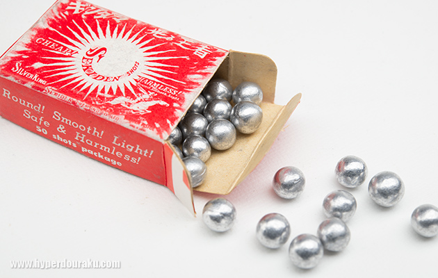 赤い小箱に入った50発入りの銀玉。この銀玉は1960年(昭和35年)に発売された。50発入りで5円。