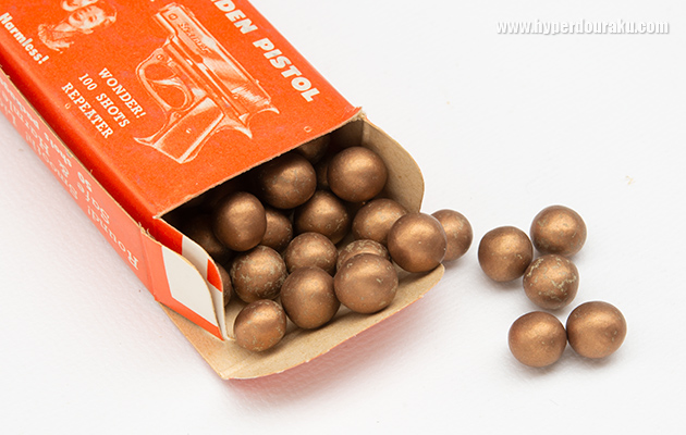 こちらは昭和44年頃に発売されたゴールド弾。銀玉と同じく珪藻土製で真鍮と銅を混ぜた粉で着色された通称「キンタマ」。そのレア度もあって少年達に大いに受けたとか。とはいっても金色というより銅色だが。