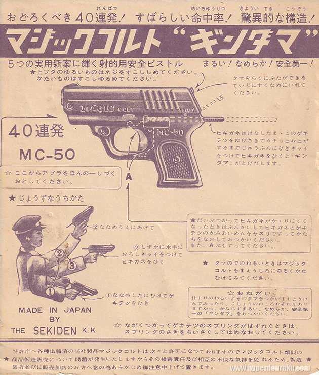 今回紹介するのは本コーナー最古となる一丁、セキデンのマジックコルト MC-50という銀玉鉄砲だ。