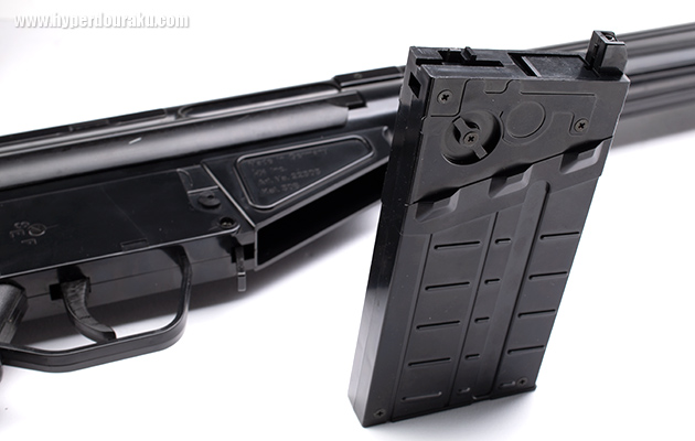 マガジン装弾数は40発。マガジンリップは無く、右側面のダイヤルを回してフォロアーを縮め、6mmBB弾を40発装填する。本体にセットすると上面のスイッチが押されフォロアーがリリースされる仕組み。なので、撃ちきる前にマガジンを抜いてしまうと残りのBB弾がすべて溢れる。