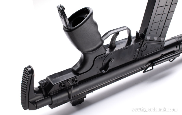 レシーバー上部のキャリングハンドルも可動する。右面のマガジンキャッチはダミーで、トリガーガード前のリリースレバーでのみマガジンを取り外すことができる。セレクターインジケーターはライブで可動する。