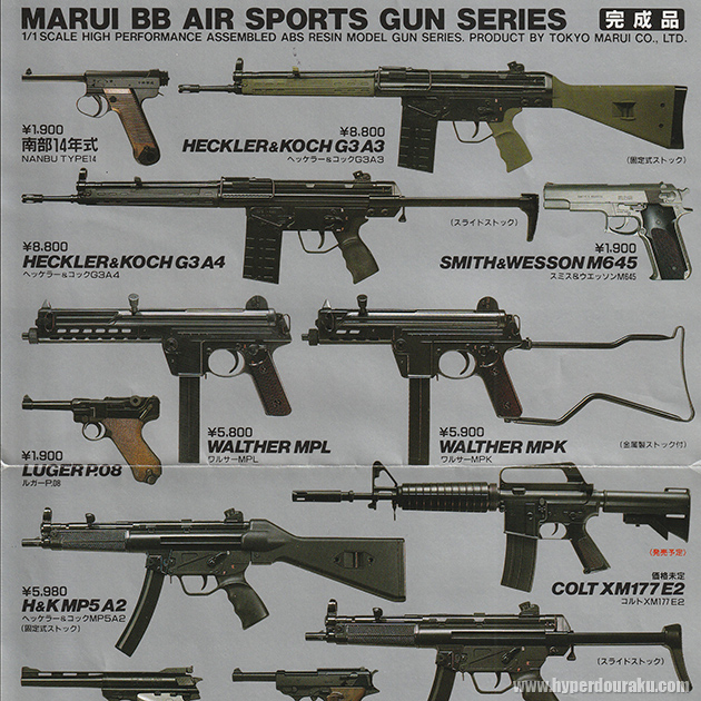 当時のカタログ。ワルサーMPL、H%K MP5、UZIなどの長物エアコッキングガンはすでに発売されており、M16A1、XM177E2は発売予定となっている。カタログ表面、裏面。