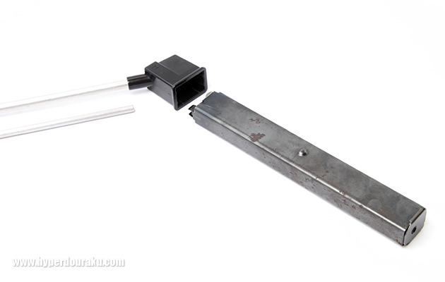 マガジンはスチールプレス製の外装でフォロアーやBB弾が外から見えないためリアルだったが、装填には長いチャージャーが必要だった。またフォロアーを前後逆にすれば空撃ちモードになる。